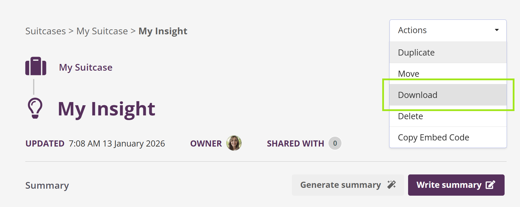 Note: You must own the Suitcase containing the Insights in order to share them with others. This means you created the Suitcase yourself or duplicated it into your own space.