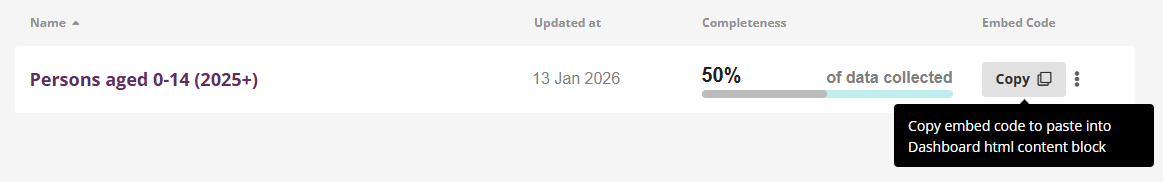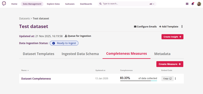 - Click Copy on the relevant measure in the Dataset Completeness Measures tab list to copy the embed HTML code to your clipboard.