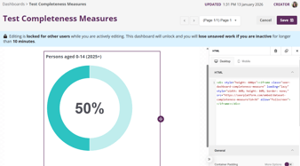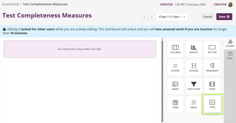 - To use Completeness Measures in a Dashboard, add a HTML block from the Dashboard content selector and paste the copied code in to display the measure.
