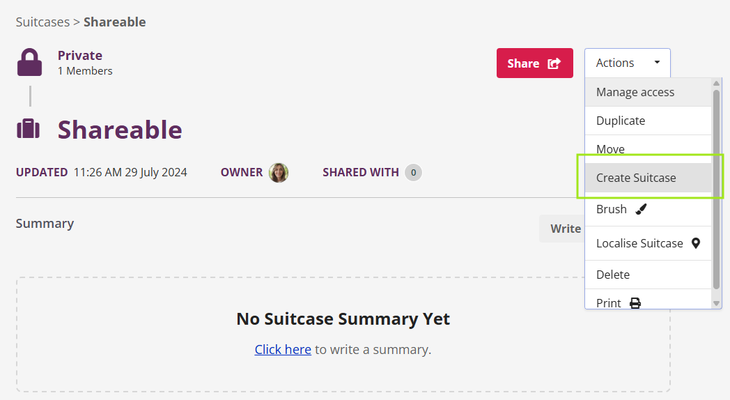 From within an existing Suitcase, you can create a new sub-Suitcase by clicking on the Actions dropdown and then selecting Create Suitcase