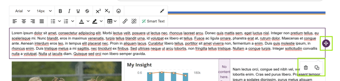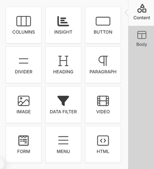 All available content blocks are located in the Content tab within the editor. From here, you can click, hold, and drag blocks onto your Dashboard canvas.