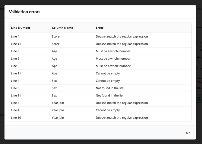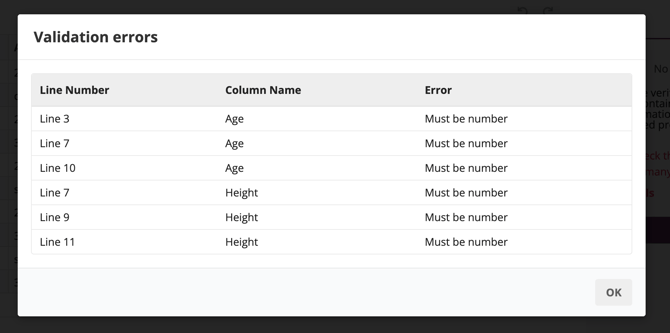 If you have configured the data types, the system will validate number-type columns before uploading. Learn more about How to configure the data type of each column.